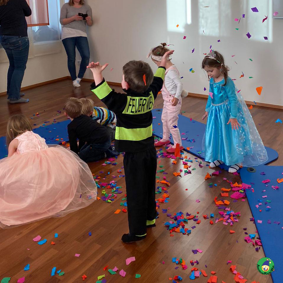 2. Eine Person sammelt alle Konfettiteile ein und wirft diese hoch und lässt sie auf alle Kinder regnen, die durch den Konfettiregen tanzen.