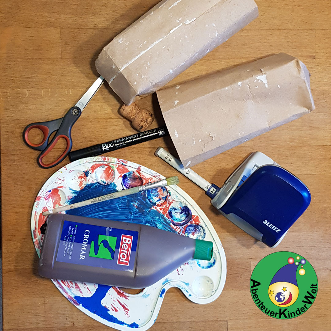 Die Kinder malen die Kartons braun an. Ist der Karton sowieso braun, kann er auch einfach so weiterverarbeitet werden.