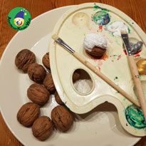Die Kinder dürfen die Nüsse mit einem Pinsel oder Schwamm bemalen. Es ist auch möglich, die Nüsse mit etwas Farbe in eine Plastikdose mit Deckel zu legen. Dann dürfen die Kinder die Dose ordentlich schütteln und heraus kommt eine gefärbte Walnuss.
