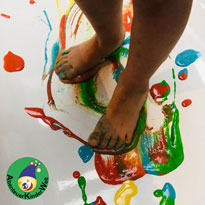 Dort dürfen sie in die Farbe treten und sie durch die Zehen flutschen lassen. Wenn sie ein gutes Fußgefühl entwickelt haben, können sie anfangen kleine MeisterWerke in die Wanne zu malen. Jetzt muss die Kamerafrau/der Kameramann schnell sein. Kaum entstanden, wird das schöne Bild schon wieder durch ein tolles neues übermalt. Früher oder später werden sich die Kinder auch hinsetzen und mit den Händen weitermalen. Die Reste der Farbe werden dann mit eines sanften warmen Dusche sauber weggespült. Was für ein Spaß.