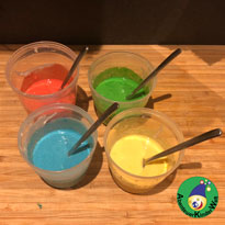 Alle Materialien gut miteinander vermischen und so lange verrühren bis keine Klümpchen mehr in der Mehlfarbe sind. Die Farbe sollte die Konsistenz einer weichen Creme haben, da hierbei die Farbe am stärksten herauskommt. Diese Farbe ist völlig ungiftig und kann kostengünstig und schnell hergestellt werden. Selbst wenn die Farbe gegessen wird, kann nichts passieren.