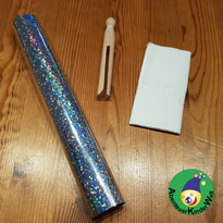 Die Kinder ziehen vorsichtig einen Teil des Klebeschutzes der Glimmerfolie ab und kleben den Pappflügel auf. Dann den Rest der Schutzfolie abziehen und den Flügel komplett einkleben. Jetzt dürfen die Erwachsenen die überstehende Folie abschneiden.
