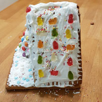 Das fertige Haus gut trocknen lassen und dann kann losgeknuspert werden! Das ist ein schöner Anlass das Lied 'Hänsel und Gretel verliefen sich im Wald' zu singen.