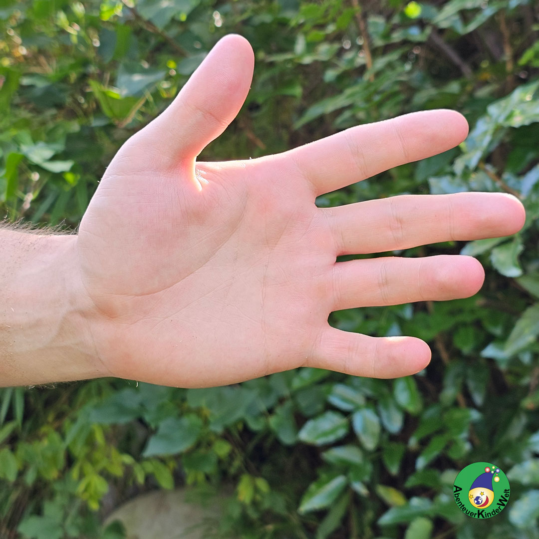 Nimm die Hand deines Kindes so in die Hand, dass die Handinnenfläche nach oben zeigt. Dann malst du in Verbindung mit dem unten stehenden Malreim eine Sonne auf die Hand.