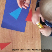 Die Kinder suchen sich ein Dreieck aus, bestreichen es mit Kleber und kleben es auf den blauen Tonkarton. Der Tastsinn wird beim Aufkleben angesprochen. Wenn sie genug Tannen aufgeklebt haben, wird das MeisterWerk mit Korken und/oder Schneeflockenstempel "beschneit". Wenn die Stempelfarbe getrocknet ist, werden die Sterne aufgeklebt. Bei diesen beiden Schritten geht es um die Hand-Auge-Koordination und den Stempelspaß.