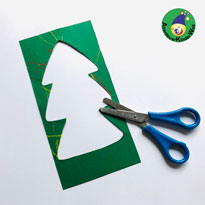 Als erstes wird die Schablone auf die neu zu gestaltende Karte gelegt. Schablone und Karte liegen genau übereinander und können z.B. mit (Büro)Klammern fixiert werden. Jetzt ist das Innere des Tannenbaums frei und kann vom Kind gestaltet werden. Den Rand des Tannenbaums zeichnet der/die Erwachsene am besten vorab mit einem Wachsmalstift oder einem Holzstift nach. Die weitere Aufgabe des/der Erwachsenen besteht nur darin, die Schablone festzuhalten, damit der Baum wirklich nur im Inneren verschönert wird.