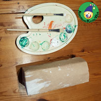 Die Kinder bemalen die vorbereiteten Kartons mit Pinsel oder Schwamm.