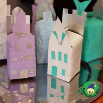 Wer den Naturlook lieber mag, benutzt einfach die abgezogenen Getränkekartons und verfährt ansonsten genauso wie beschrieben. Die Fenster wirken bei dieser Variante aufgemalt besser. Das können die Kinder sehr gut selbst mit den Stabilo Woodystiften machen, wenn man den Getränkekarton mit etwas Festem gut ausstopft (z.B. Styroporreste zuschneiden, passender Bauklotz oder einen passenden Turm aus Legosteinen bauen und in die Tüte stecken). Die Häuser können jetzt z.B. von den Kindern noch mit Sternen verziert werden.