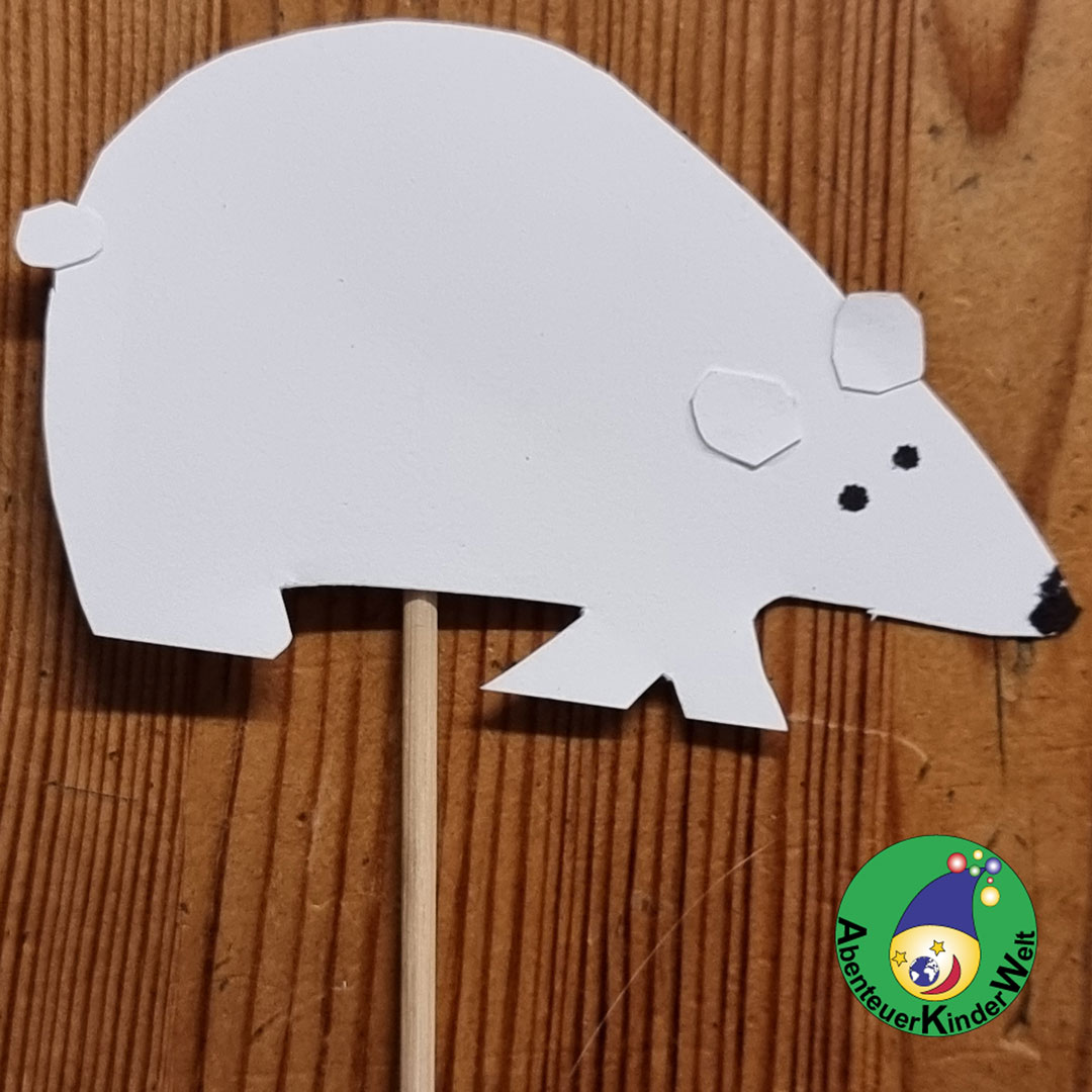 Dazu Körper, Ohren und Schwanz ausschneiden und zusammenkleben. Nase und Augen mit schwarzem Filzstift zeichnen. Den Eisbär mit Tesafilm am Schaschlickspieß befestigen, wenn man die Geschichte erzählen will.
