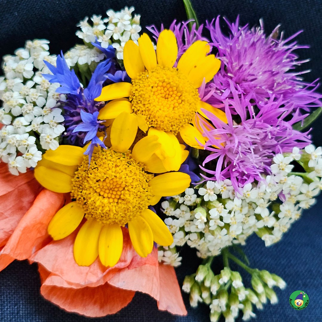 Die Kinder sammeln verschiedenfarbige Wiesenblüten.