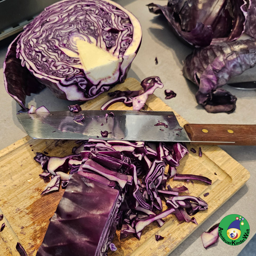 Die Kinder zereissen die übriggebliebenen äußeren Rotkohlblätter in kleine Fetzen und legen einen Teil in eine Schüssel und einen Teil in einen kleinen Kochtopf. Die Blätter in der Schüssel werden mit kochendem Wasser übergossen und beschwert, so dass sie alle unter Wasser liegen. Die Schüssel wird bis zum Abkühlen außer der Reichweite der Kinder platziert.
