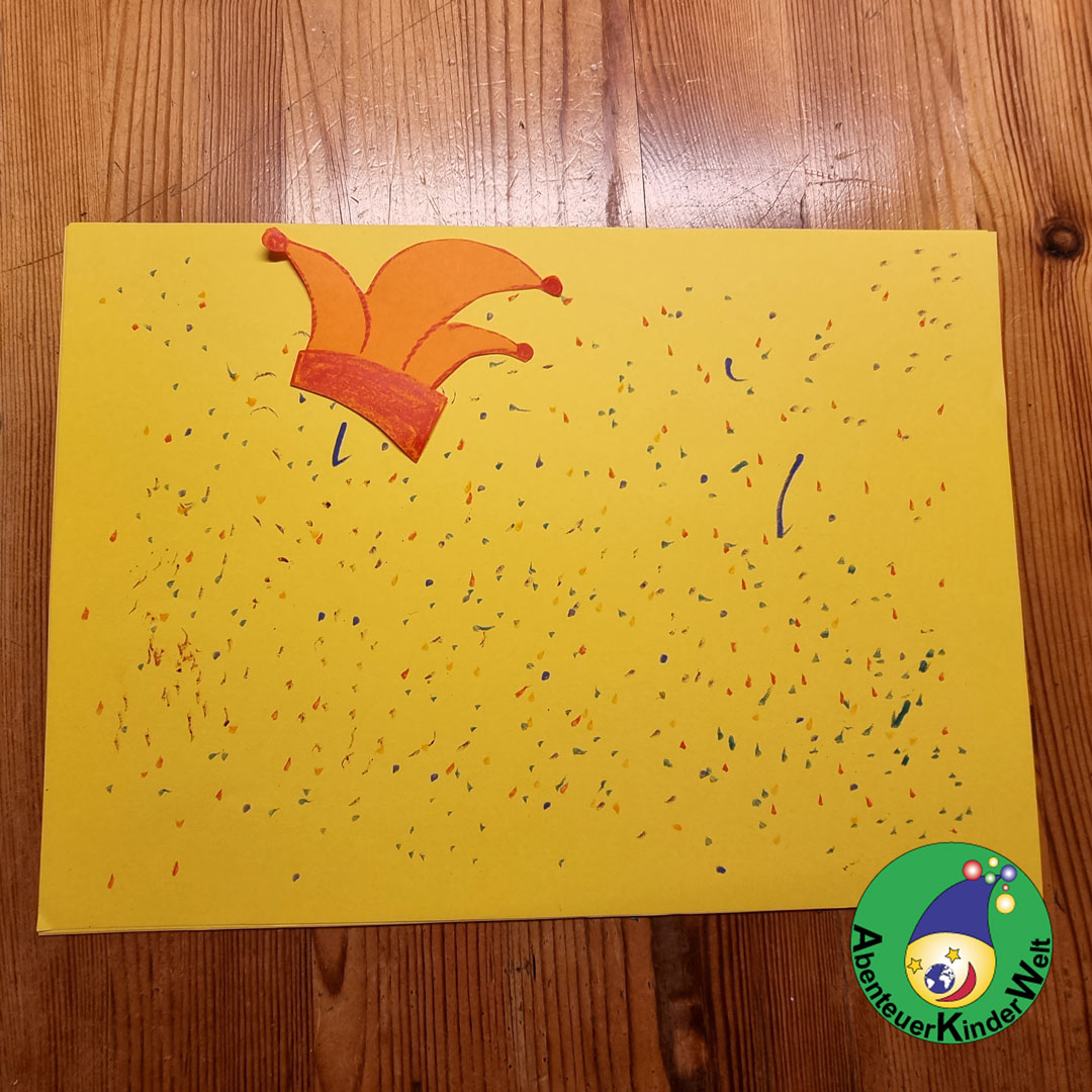 Sind die Kinder mit ihrem Punktbild zufrieden, dürfen sie einen schönen Platz für die Narrenkappe suchen und diese festkleben. Manchmal entstehen beim Punkten kleine Striche - das könnte eine Nase sein.