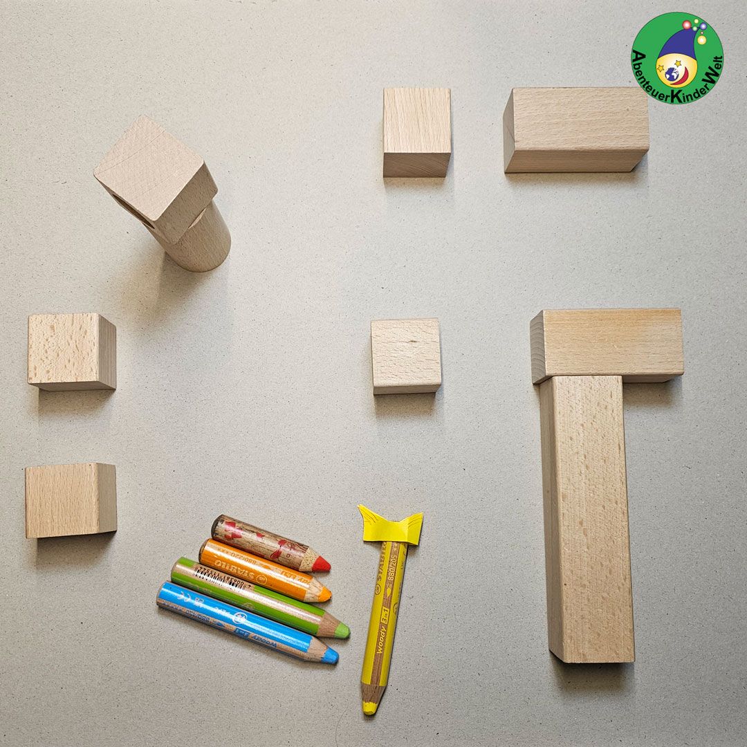 Das besondere an diese Geschichte ist das Malen um die Bauklötze herum. Dabei wird die Hand-Auge-Koordination gefordert. Je enger die Bauklötze stehen, desto schwieriger wird es.