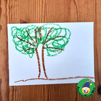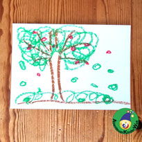 Die Kinder malen zur Geschichte. Wer mag, malt einen braunen Stamm vor oder klebt später einen solchen dazu. Die Baumkrone entsteht in wilder Kritzelei - schließlich rüttelt der Sturmwind heftig daran. Die ersten zwei Zeilen werden so lange wiederholt, bis das Kind eine grüne Baumkrone gemalt hat. Wer möchte, malt die Äpfel mit einem anderen Grünton, damit man sie auch in der Baumkrone noch gut erkennen kann.