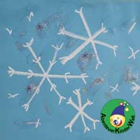Die Kinder tragen Kleber auf ihr fertiges Schneeflockenbild auf und streuen Glitter oder Schneeflocken (Stanz- und/oder Streuteile) auf.