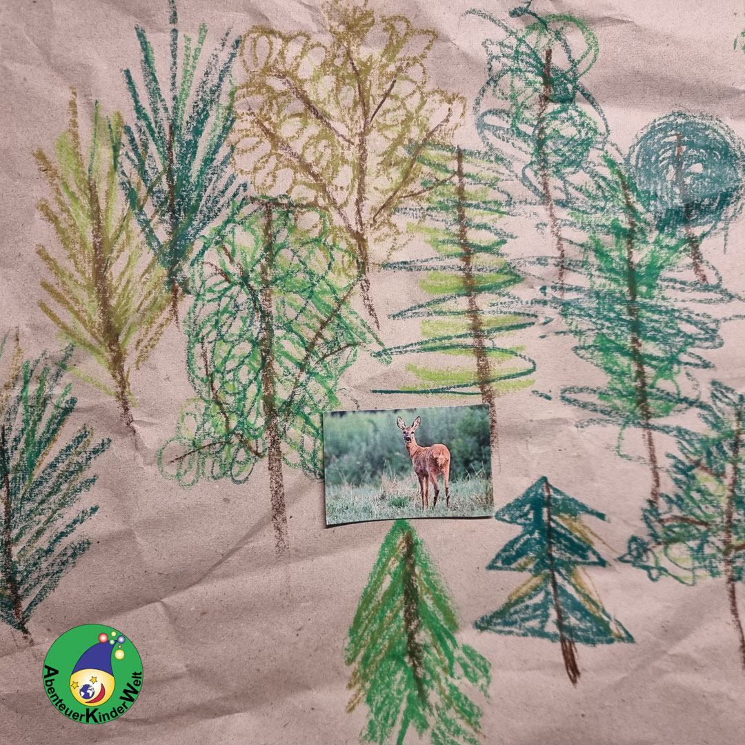 Dann dürfen die Kinder mit verschiedenen Grüntönen Baumkronen kritzeln. Da können auch schon die Kleinsten mitmachen.