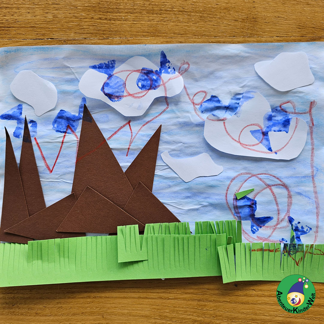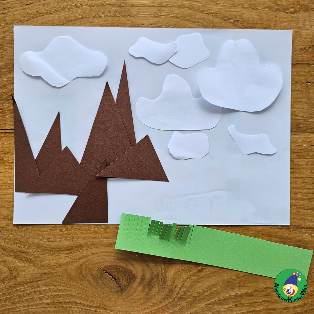 Papierstreifen anbieten, auf Spannung halten und die Kinder mit beidhändiger Scherenhaltung schneiden lassen. So können sie in diesem Beispiel die Berge (=Dreiecke aus den Streifen) und das Gras (= einschneiden in den Streifen) schon selbst schneiden.