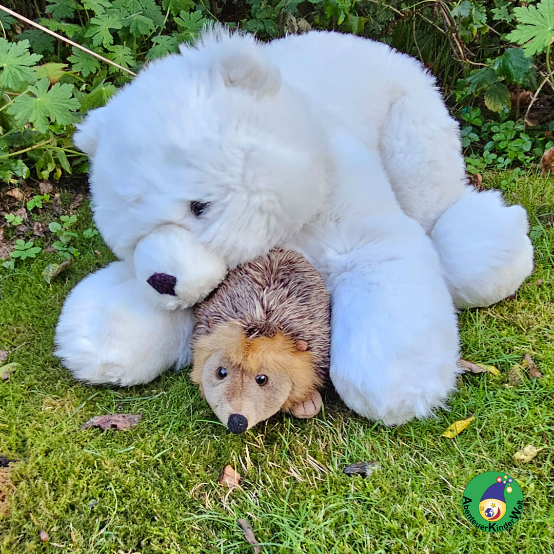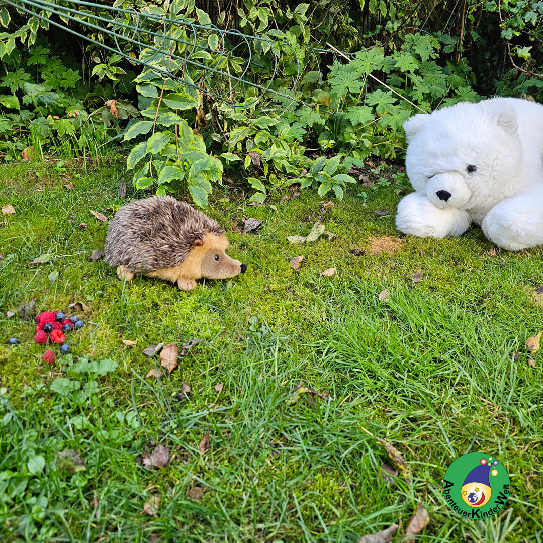 Bären und Igel halten Winterschlaf. Beide Tiere müssen sich im Herbst einen Fettvorrat anfressen. Der Bär verschläft den Winter in einer Höhle. Der Igel sucht Schutz unter Blätterhaufen und in Holzstapeln. Wer einen Garten hat, lässt einen dicken Laubhaufen für den Igel in einer geschützen Ecke liegen, damit er es schön warm hat.