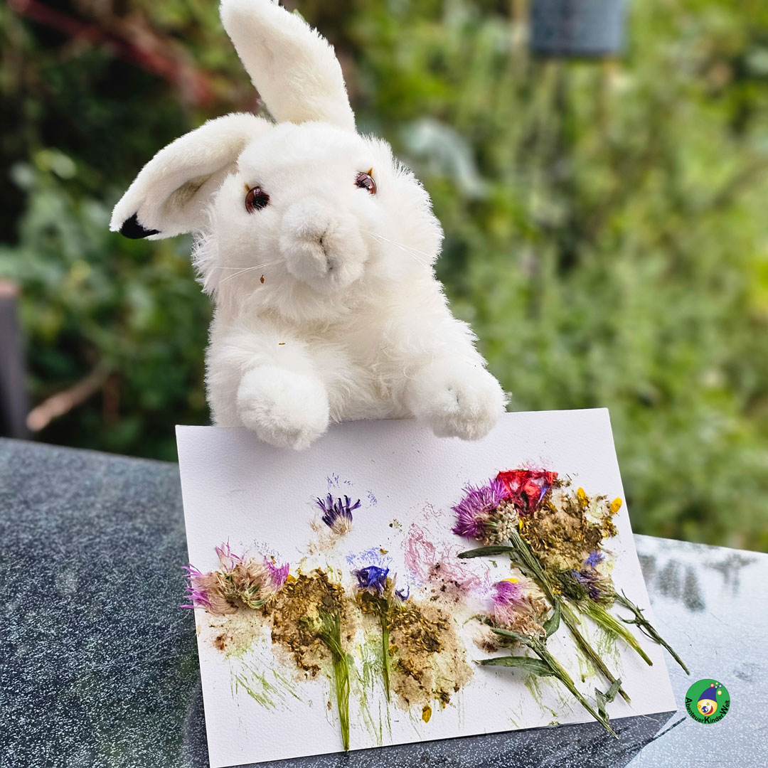 Jetzt klopfen die Kinder mit einem flachen Stein oder einem Bauklotz fest und ausdauernd auf das Blatt. Dazu den Klopfspruch weiderholen. Dadurch übertragen sie den Blütensaft auf das Papier und eine ganz eigene Sommerwiese entsteht.