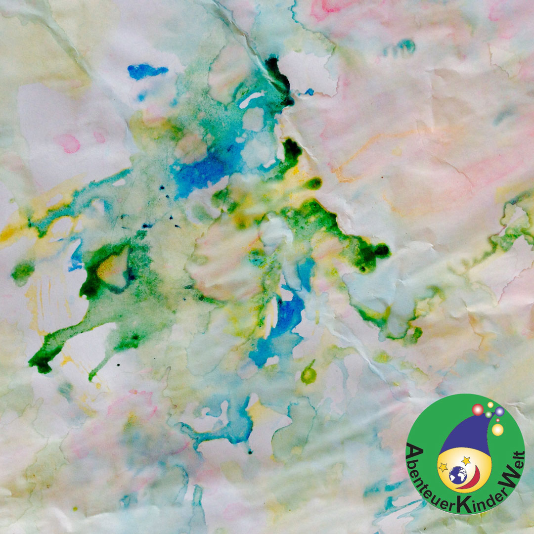 Bei dieser Aktion wird es feucht. Am besten einen dicken Stapel Zeitungspapier oder ein altes Frotteehandtuch unterlegen. Wird das Bild zu nass, verschwimmen alle Farben.