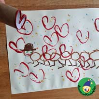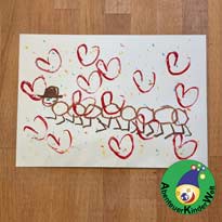 Die Kinder tauchen den "Herzstempel" in die Farbe und stempeln Herzchen auf das Bild. Die Herzen werden am schönsten, wenn sie maximal zwei Herzen stempeln und dann wieder neue Farbe aufnehmen.