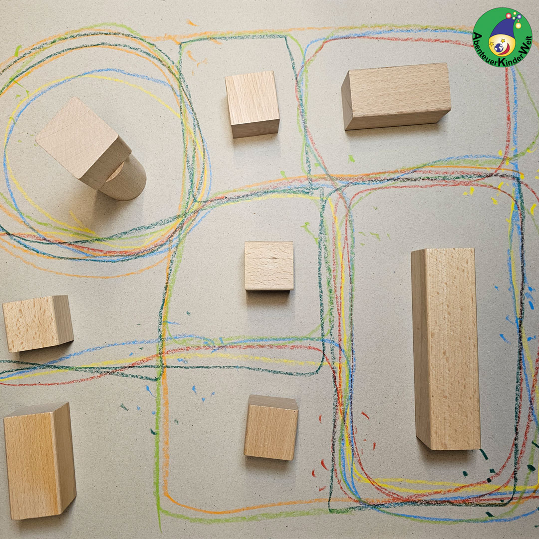 Das besondere an diese Geschichte ist das Malen um die Bauklötze herum. Dabei wird die Hand-Auge-Koordination gefordert. Je enger die Bauklötze stehen, desto schwieriger wird es.