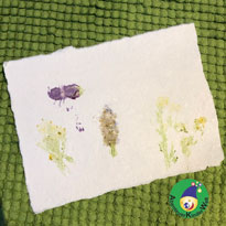 Und nun dürfen sie wild auf das Papier hämmeren. Dabei wird der Blütensaft herausgepresst und dieser drückt sich in das Aquarellpapier. Das Hämmern wird mit dem rhythmischen Spruch von den Hammerblüten begleiten.