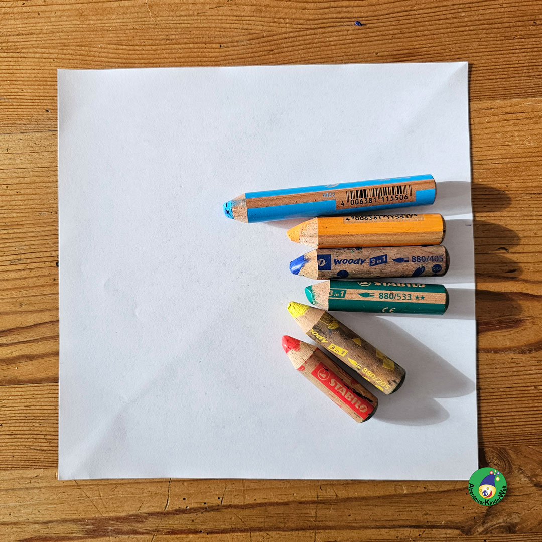 Idealerweise malen Kinder mit kurzen dicken Buntstiften oder Wachsmalstiften, da sie beim Halten von dünnen Stiften noch bis zum Alter von 7 Jahren sehr leicht zu stark verkrampfen.