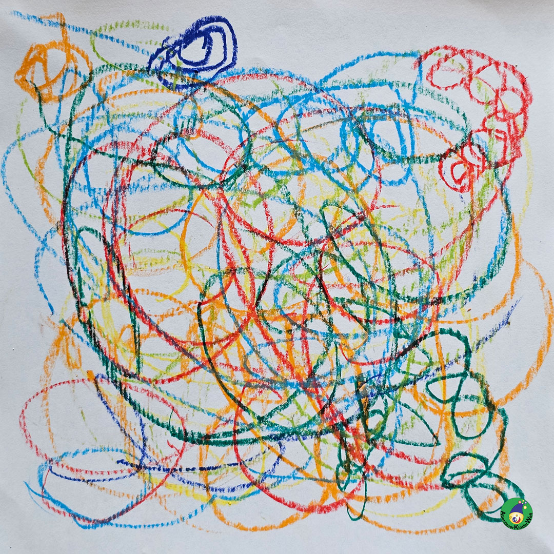 Die Kinder malen Kreise und Spiralen zur Geschichte, die die Betreuungsperson wiederholt spricht. Dabei können die Kinder immer wieder die Stiftfarbe wechseln.