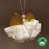 In die Mitte des Flügels einen Streifen Heißkleber geben und den Rücken des Engels aufdrücken. Zum Schluss den „Heiligenschein“ mit einem Tropfen Heißkleber am Kopf befestigen.