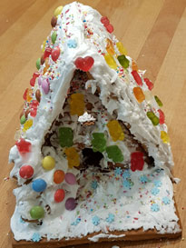 Das fertige Haus gut trocknen lassen und dann kann losgeknuspert werden! Das ist ein schöner Anlass das Lied 'Hänsel und Gretel verliefen sich im Wald' zu singen.