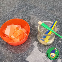 Nur die orangen Schnipsel verbleiben auf dem Tisch. Der Kleber und die Klebepinsel werden bereitgestellt. Nicht alle Kinder mögen es, den Kleber mit den Fingern zu verstreichen. Aber das ist natürlich auch erlaubt.