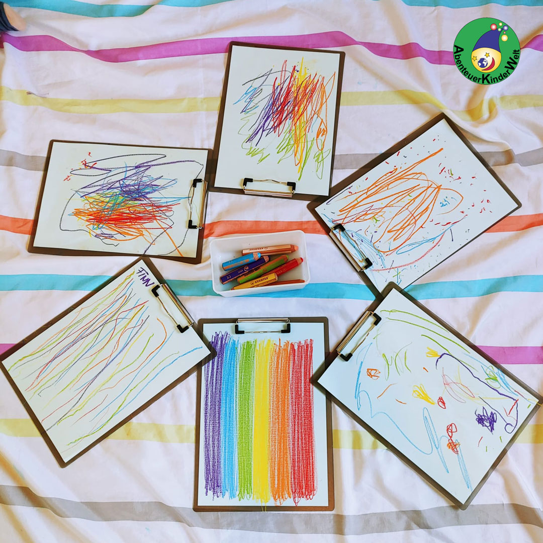 Mit großer Aufmerksamkeit und Konzentration verfolgen die Kleinen die Malgeschichten in den Gruppenstunden und zu Hause. Gerne nutzen sie die Gelegenheit selber zum Stift zu greifen. Nicht selten kommentieren sie auch ihre Malbewegungen: sie singen und plappern dazu. Erst später erschaffen die Kinder erkennbare Bilder. In den ersten Jahren stehen der Spaß und Freude mit dem Stift bleibende Spuren hinterlassen zu können im Vordergrund.