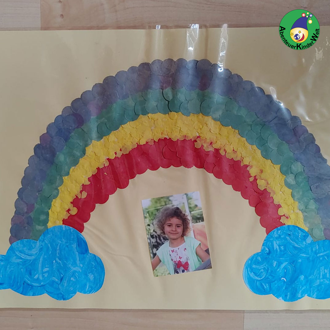 Die Kinder bekleben zur Malgeschichte die Regenbogenvorlage mit Klebepunkte. Dann kann noch ein Foto des Kindes in die Mitte geklebt und zum Schluß alles laminiert werden. So entsteht ein schönes Platzset für den Frühstückstisch.