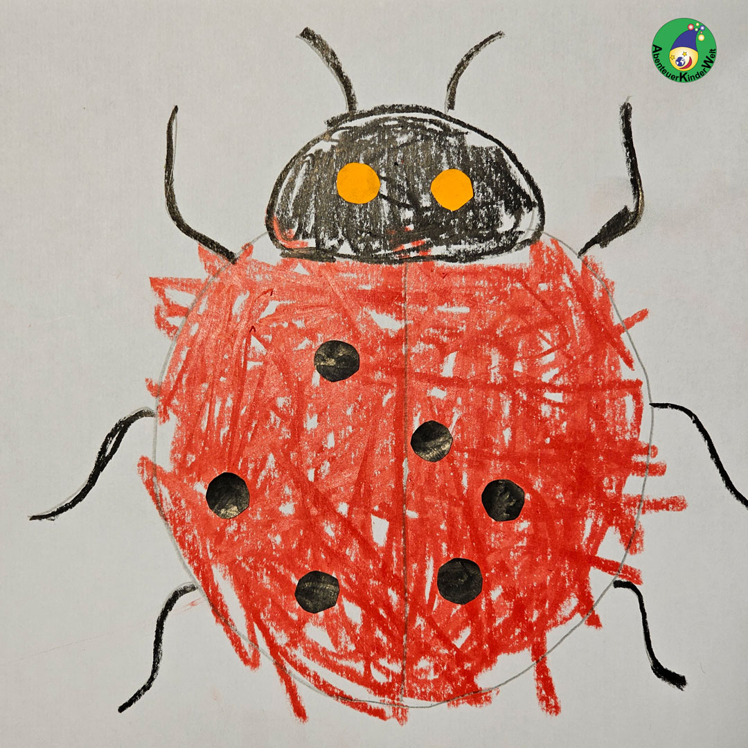 Dein Kind malt den Käfer zur Malgeschichte rot an und klebt zum Schluss schwarze Punkte auf. Anschließend malt es den Kopf schwarz an und klebt Augen auf. Der Kopf kann aber auch nur Augen bekommen.