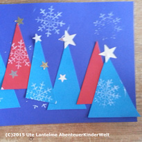 Die Kinder suchen sich ein Dreieck aus, bestreichen es mit Kleber und kleben es auf den blauen Tonkarton. Der Tastsinn wird beim Aufkleben angesprochen. Wenn sie genug Tannen aufgeklebt haben, wird das MeisterWerk mit Korken und/oder Schneeflockenstempel "beschneit". Wenn die Stempelfarbe getrocknet ist, werden die Sterne aufgeklebt. Bei diesen beiden Schritten geht es um die Hand-Auge-Koordination und den Stempelspaß.