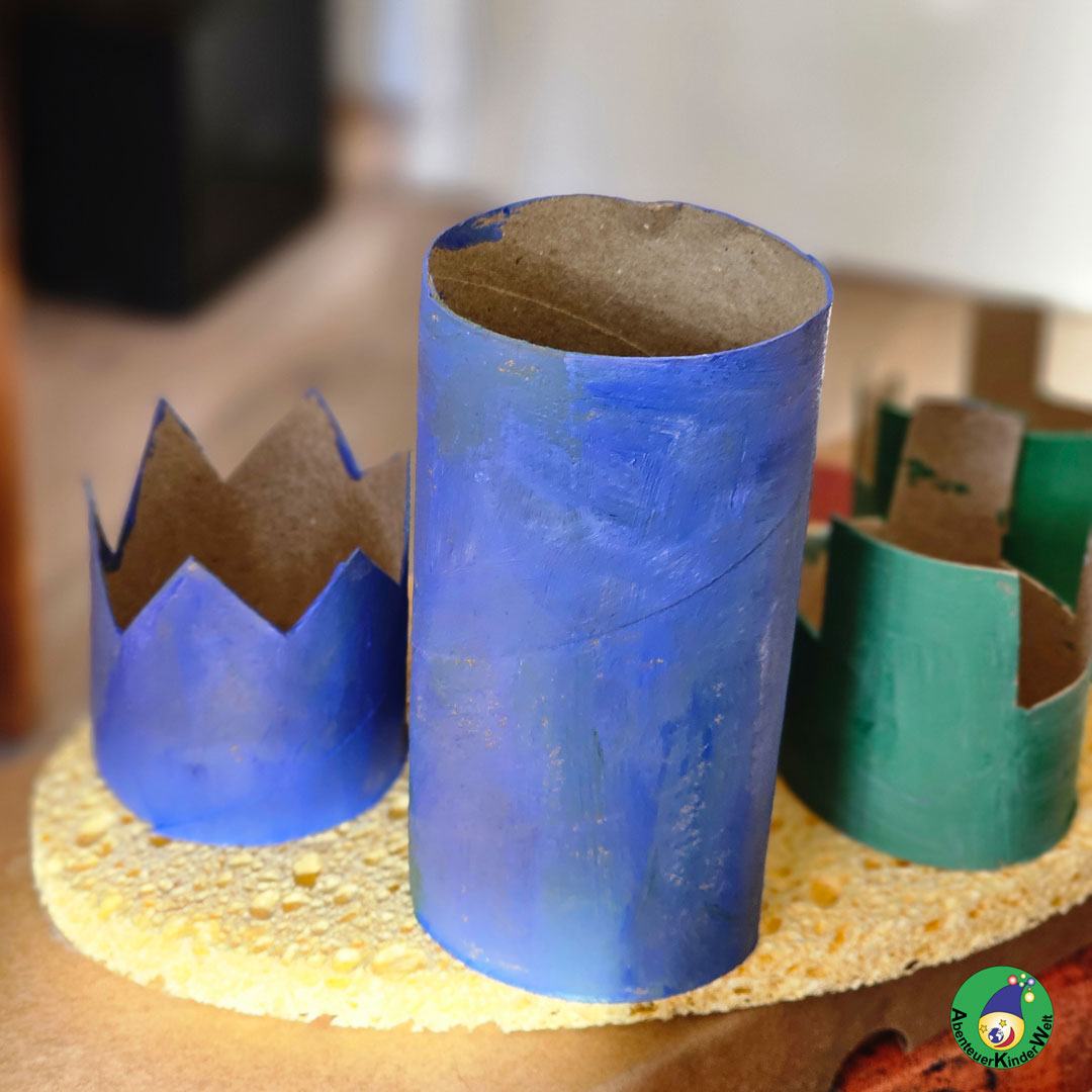 Die Farbe in einen Deckel geben und eventuell mischen. Die Kinder tupfen die Farbe auf oder verstreichen sie mit einem Schwämmchen auf den zugeschnittenen Rollen.