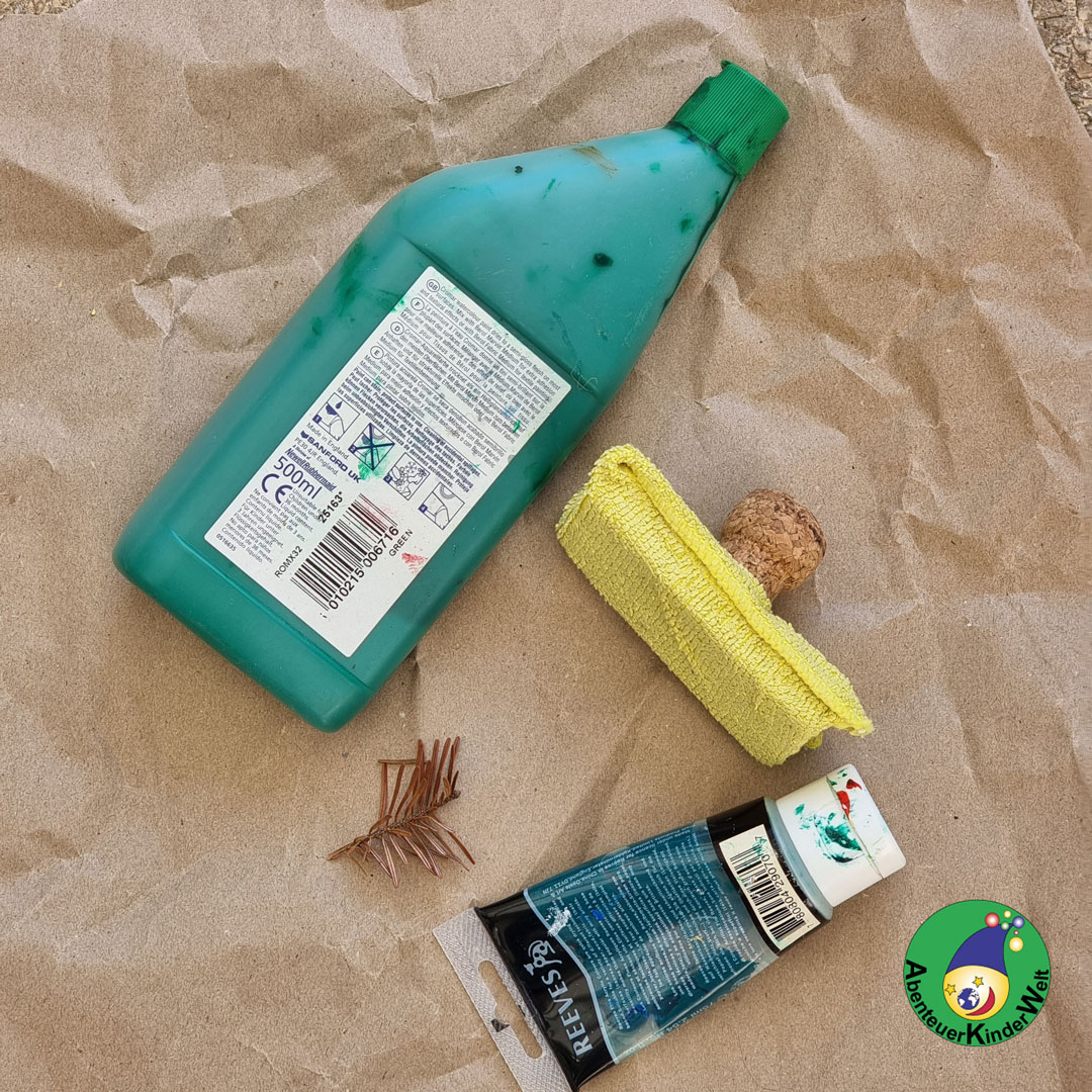 Die Kinder tauchen den Tannenzweig in die dunklere grüne Farbe und bestempeln damit das Blatt. So wird die Struktur des Moosbodens etwas herausgearbeitet.