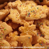 Die Plätzchen werden mit verquirlten Eigelb bepinselt und dann werden die Zuckerstreusel aufgestreut. Das klappt sehr gut mit einer kleinen Dose oder Plastikflasche, aus deren Verschluss ein kleines Loch ausgestanzt wird (maximal so groß, wie ein Locher-Loch). Dann wird die Zuckerschicht (meistens) nicht ganz soo süß.